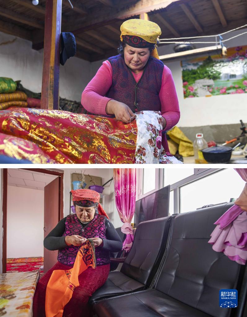 這是一張拼版照片,上圖為都熱·加爾曼的妻子那尼克·苦卡尼在山谷舊居中縫制搬遷后需要使用的新被子(2018年11月13日攝);下圖為那尼克·苦卡尼在愛(ài)民村的新家中制作手工刺繡(2020年6月3日攝)。