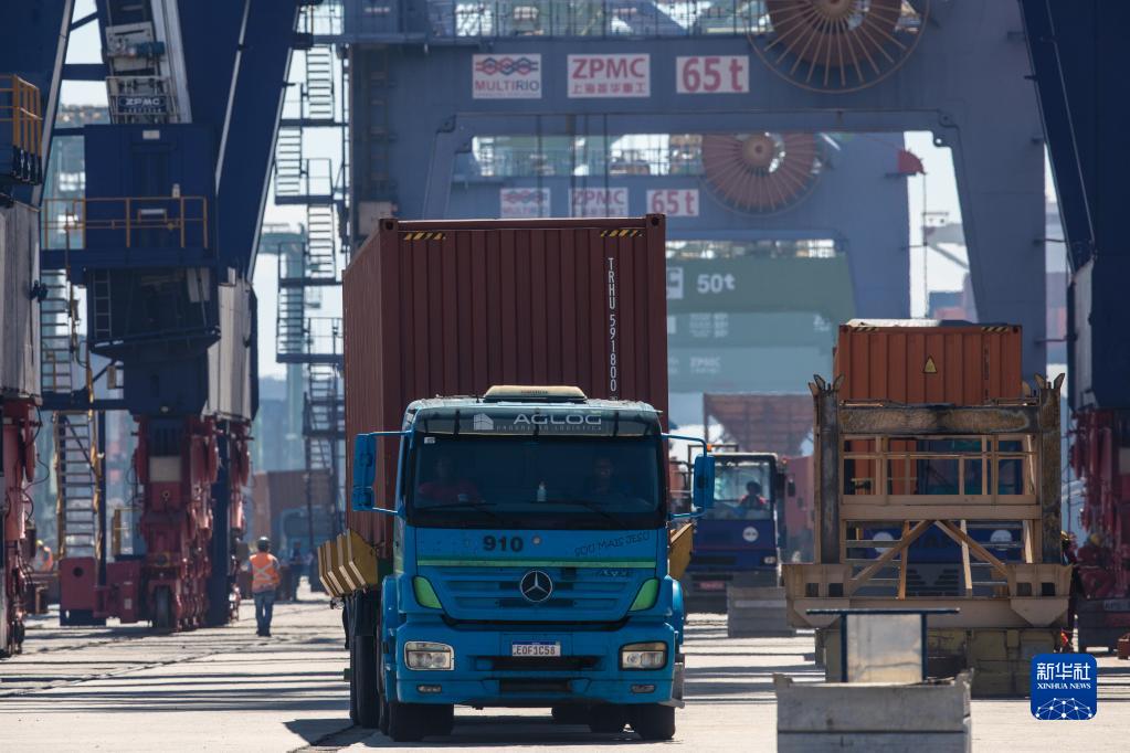 3月20日,在巴西里約熱內盧港一處集裝箱碼頭,一輛完成裝貨的卡車(chē)駛離碼頭區域。