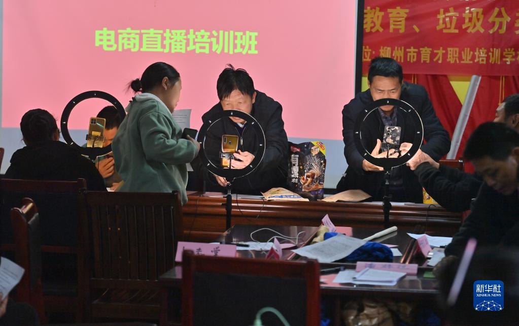 3月24日,在廣西融水苗族自治縣桿洞鄉黨鳩村,村民在學(xué)習電商直播技能。