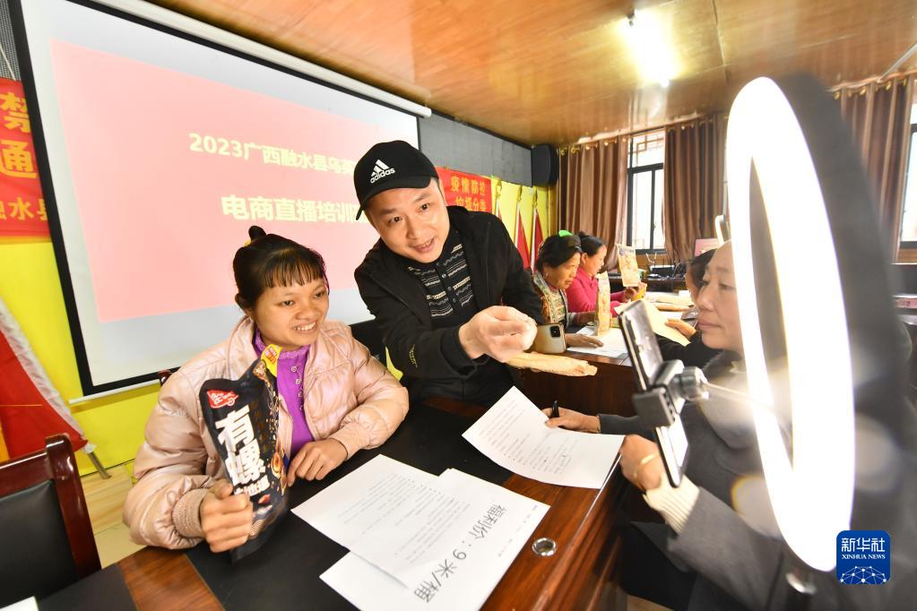 3月24日,在廣西融水苗族自治縣桿洞鄉黨鳩村,村民在學(xué)習電商直播技能。