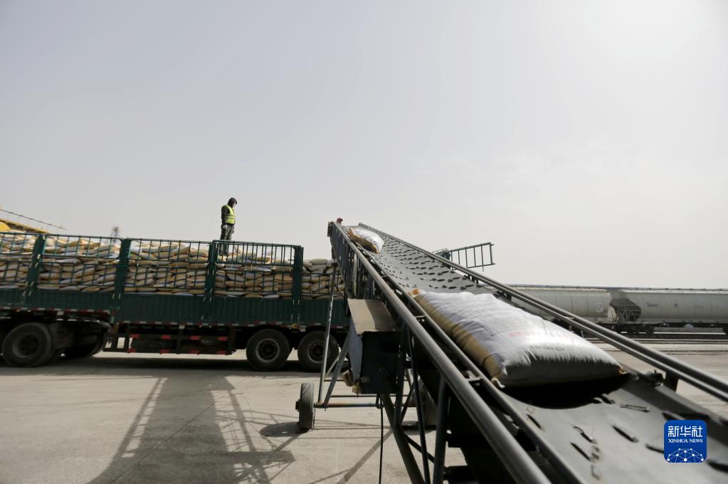 3月23日,工人們在寧安站貨場(chǎng)卸化肥。