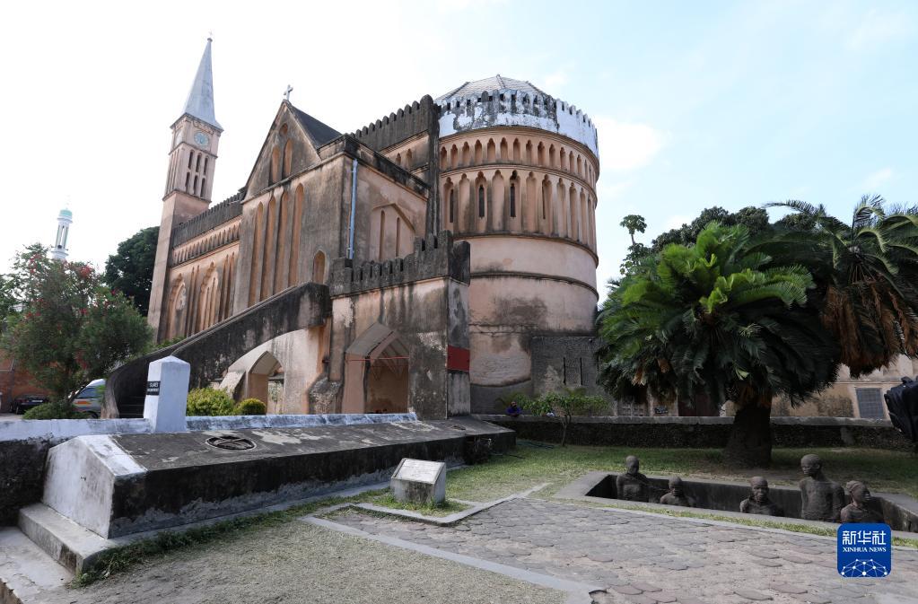 這是2月23日在坦桑尼亞桑給巴爾拍攝的基督大教堂及奴隸雕塑(右下)?;酱蠼烫盟诘卦巧=o巴爾最大的奴隸市場(chǎng)。