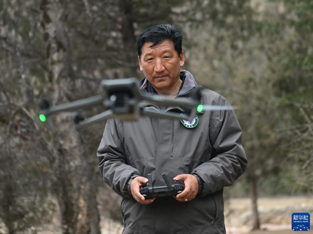 3月24日,在青海省黃南藏族自治州麥秀林場(chǎng),護林員使用無(wú)人機巡護林區。