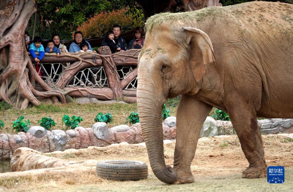 3月24日,游客在銀基動(dòng)物王國內觀(guān)看大象。
