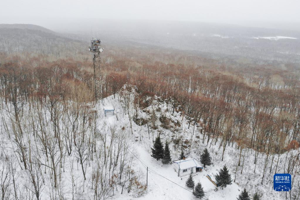 3月23日拍攝的位于中國龍江森工集團沾河林業(yè)局有限公司施業(yè)區內的彩芹瞭望塔和森林防火瞭望員平時(shí)生活的塔下小屋(無(wú)人機照片)。
