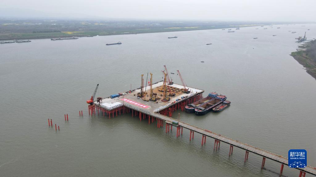 這是中鐵大橋局池州長(cháng)江公鐵大橋首個(gè)主墩開(kāi)鉆現場(chǎng)(3月25日攝,無(wú)人機照片)。
