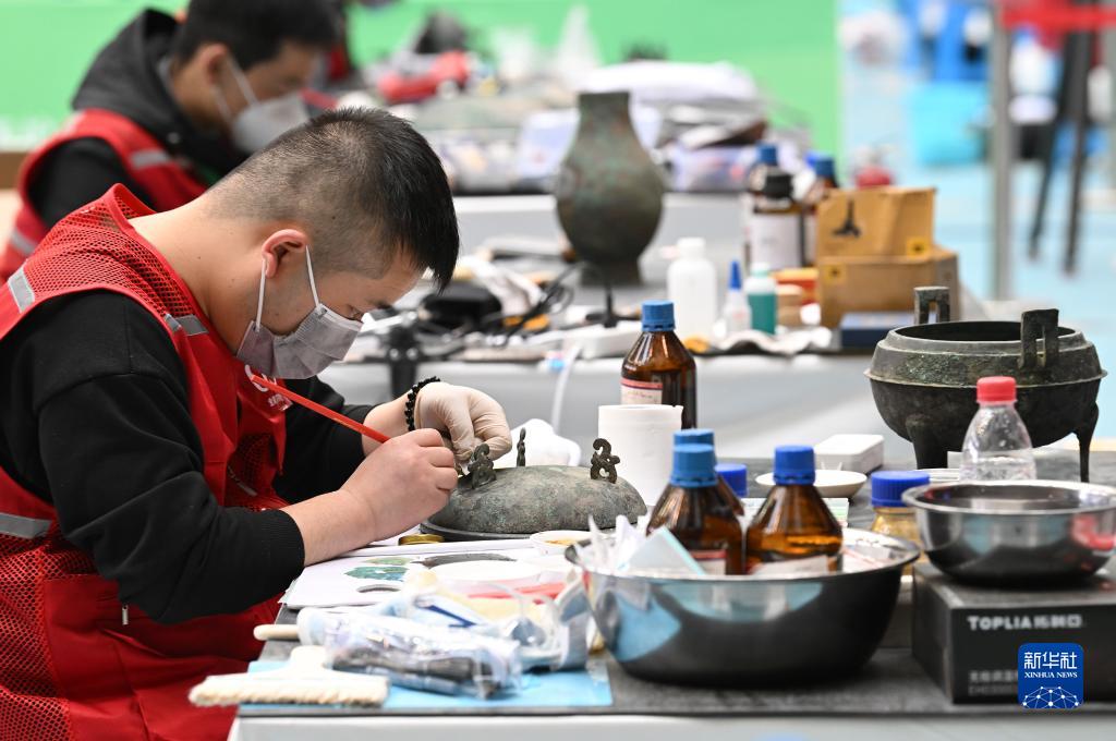 參加金屬文物修復師比賽項目的選手在現場(chǎng)進(jìn)行文物修復(3月25日攝)。