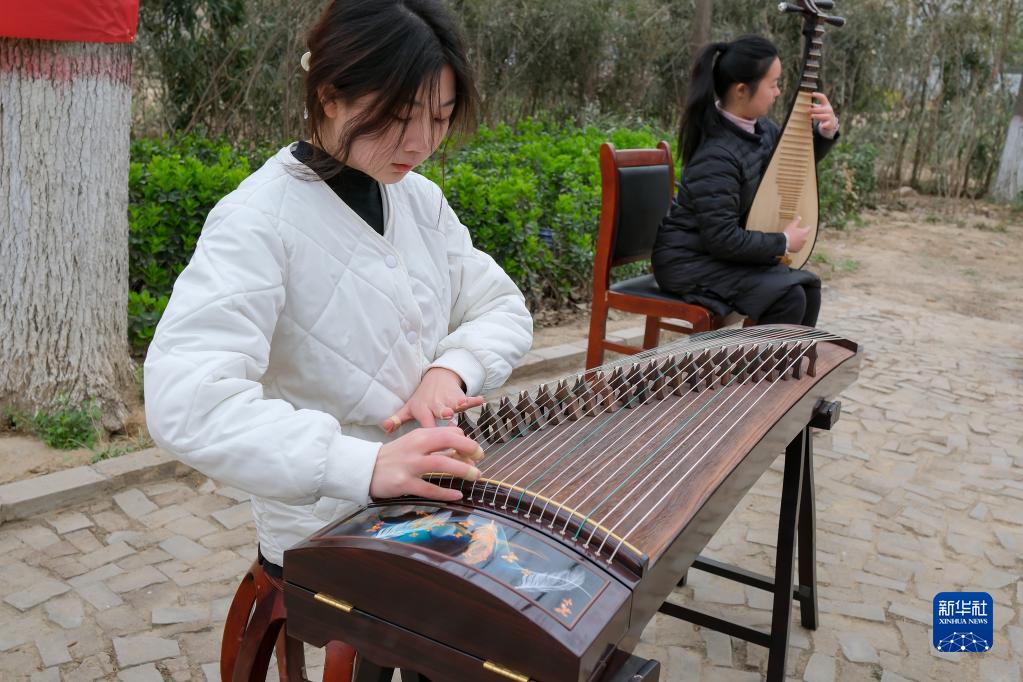 3月25日,村民在徐場(chǎng)村演奏民族樂(lè )器。