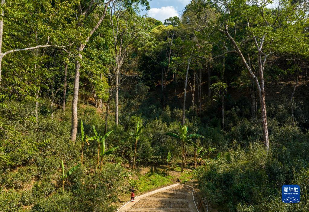 3月25日,景邁山茶農葉寶在古茶林里采茶(無(wú)人機照片)。