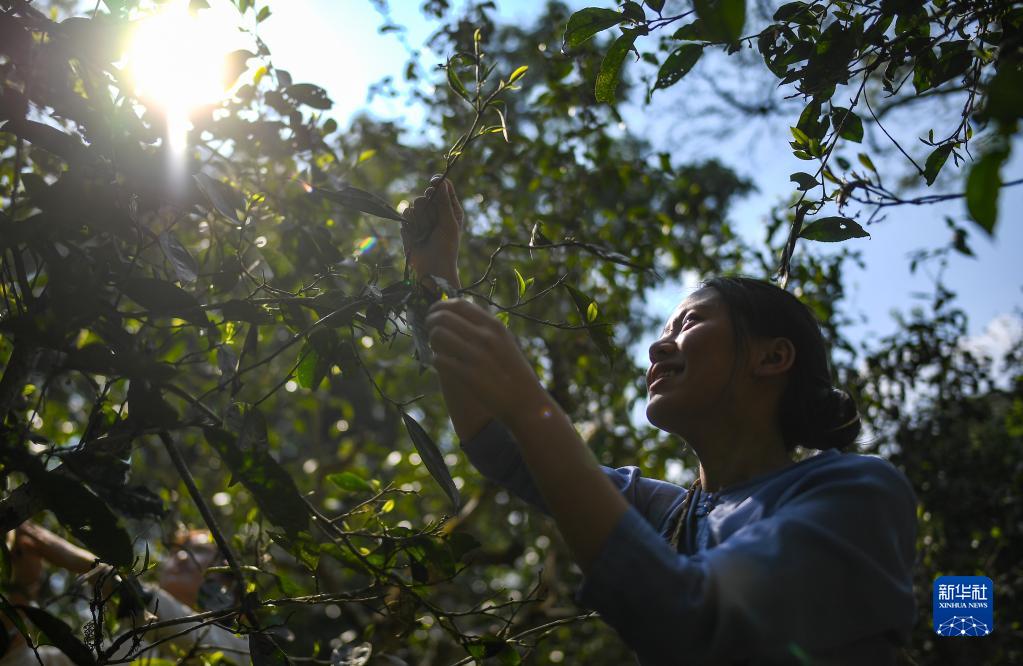 3月25日,景邁山茶農黃翠萍在古茶林里采茶。