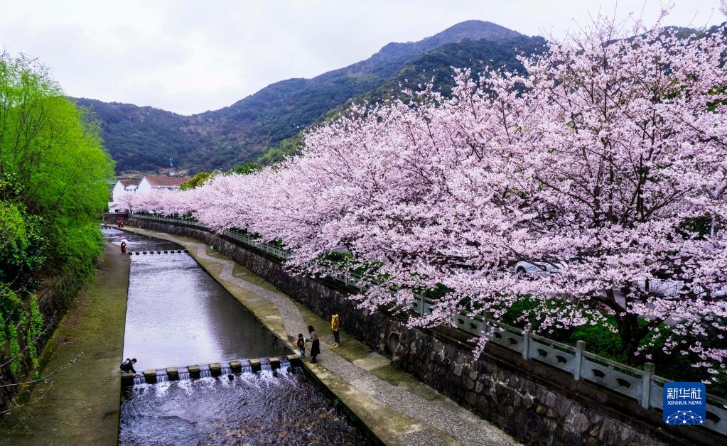 3月25日,游客在浙江省寧波市北侖區大碶街道和鴿村欣賞盛開(kāi)的櫻花(無(wú)人機照片)。