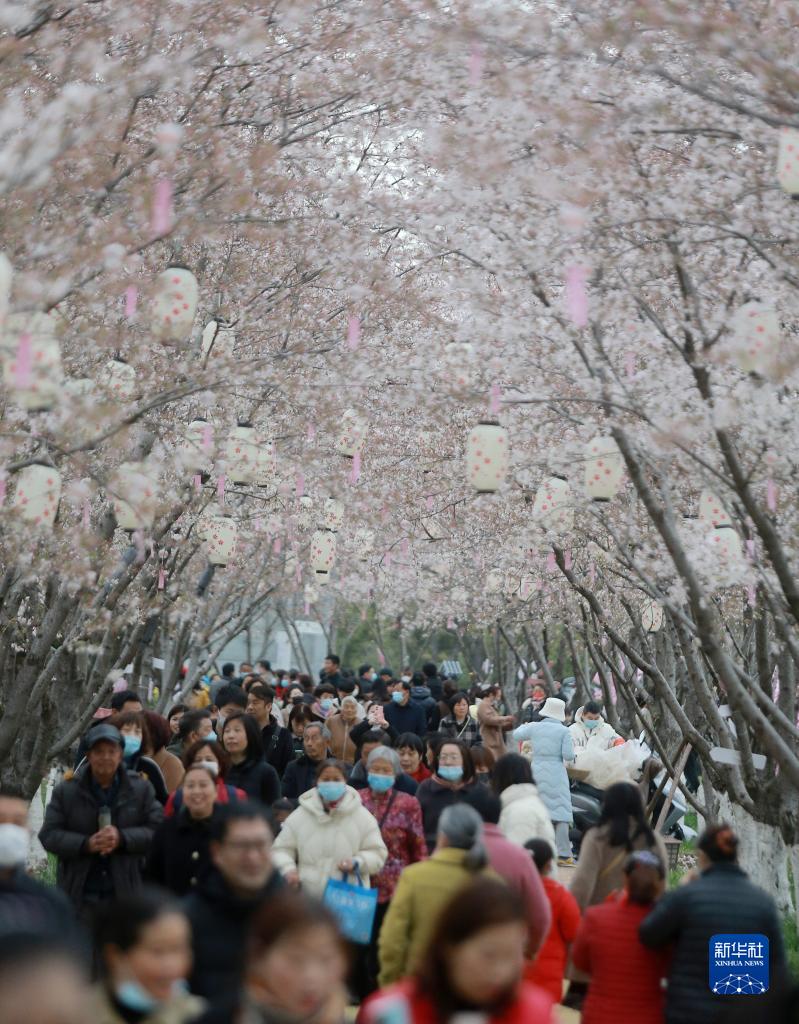 3月25日,游客在江蘇省揚州市邗江區甘泉街道的櫻花園賞花游玩。