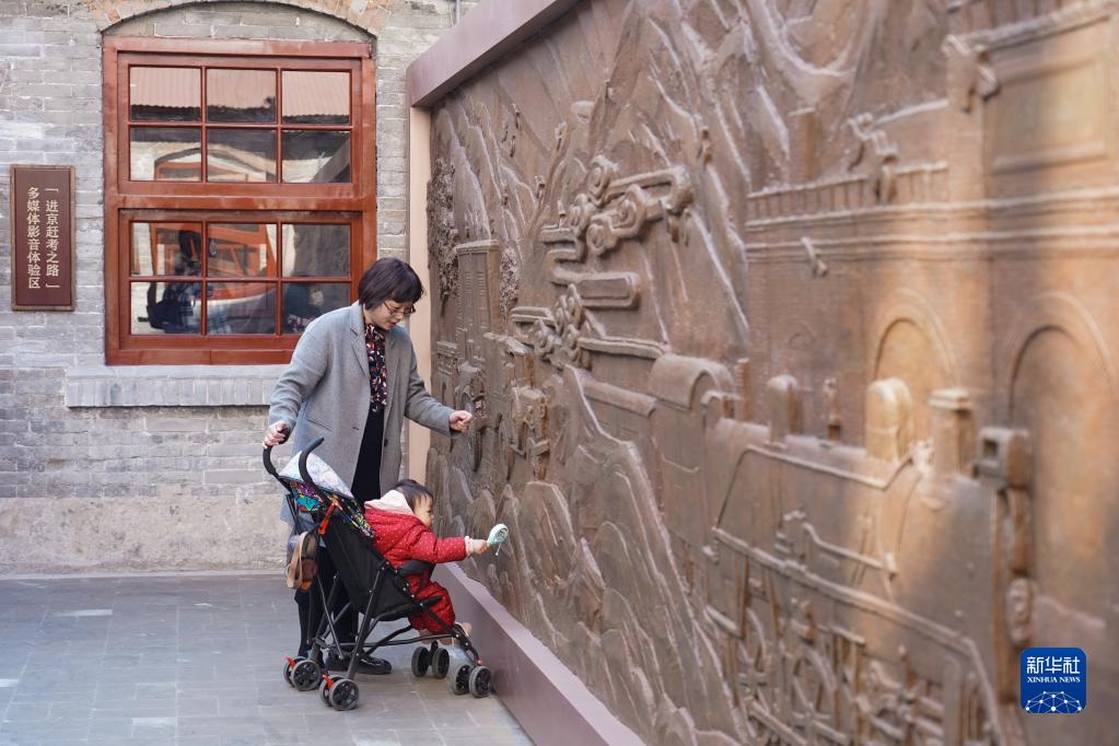 3月25日,一位游客帶著(zhù)孩子參觀(guān)清華園車(chē)站舊址內的一處浮雕。