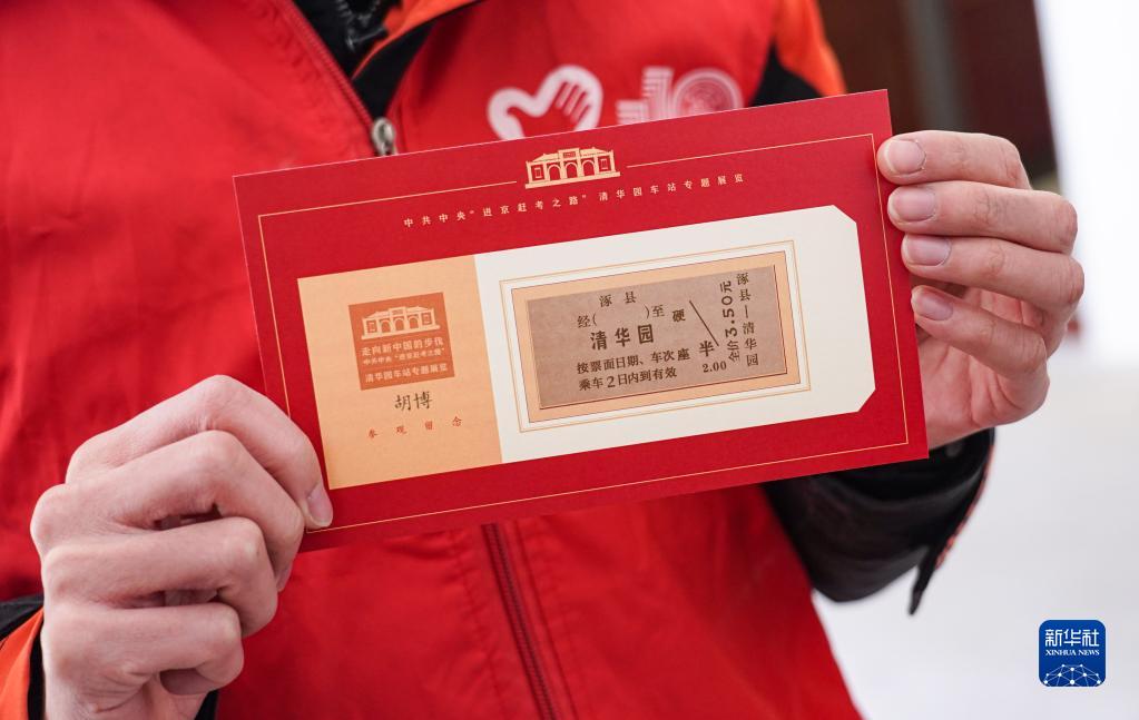 3月25日,在清華園車(chē)站舊址的專(zhuān)題展覽廳內,一名志愿者展示印有“老車(chē)票”的紀念卡片。