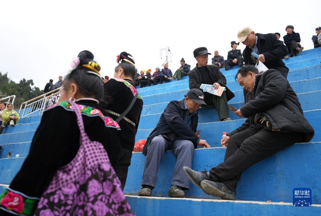 3月26日,“村BA”決賽場(chǎng)地看臺上,提前七小時(shí)來(lái)到球場(chǎng)的臺盤(pán)村村民邊等待開(kāi)賽邊打撲克牌。