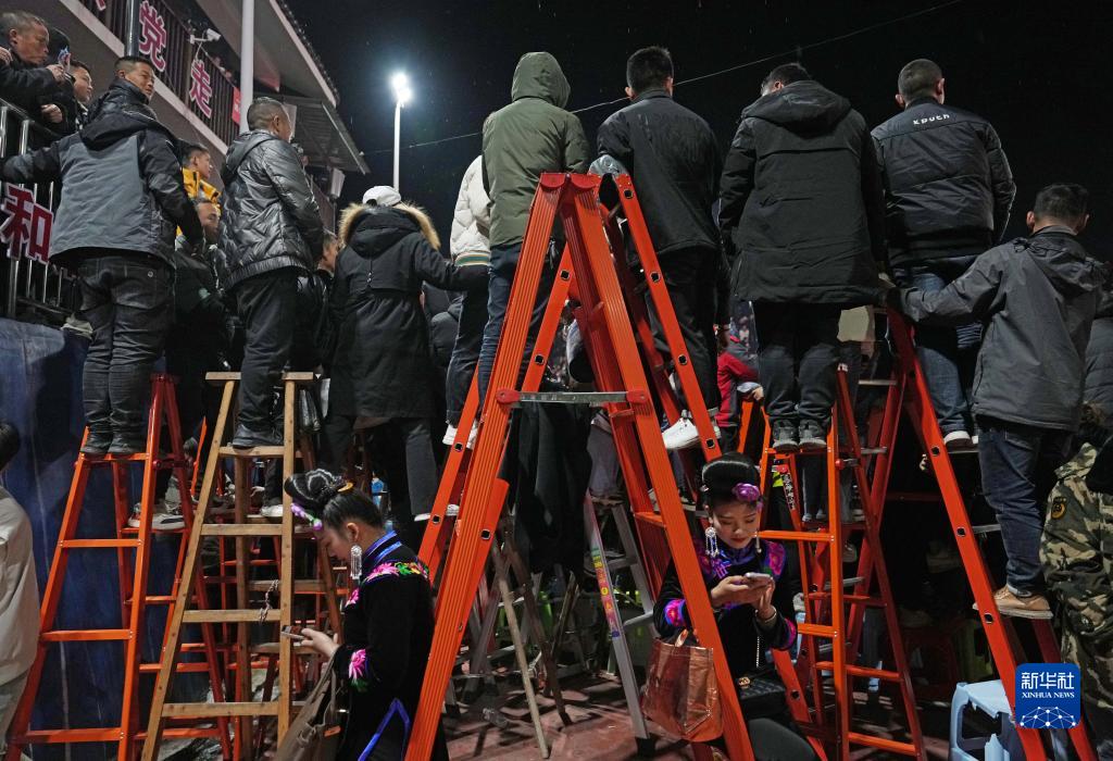 3月26日,“村BA”總決賽賽場(chǎng)邊,當地觀(guān)眾搭梯子觀(guān)看比賽。