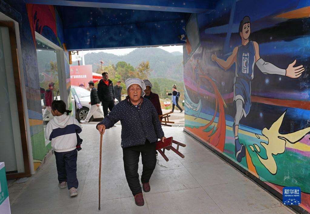 3月26日,80歲的臺盤(pán)村村民楊再來(lái)進(jìn)入“村BA”決賽場(chǎng)地準備觀(guān)看比賽。