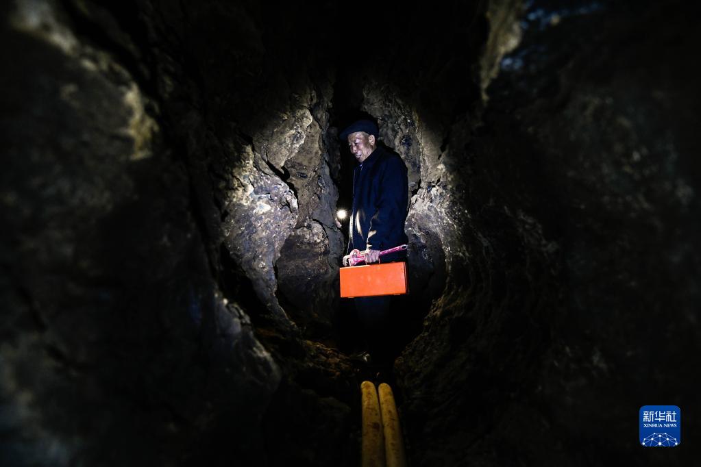 管水員陳光明在貴定縣盤(pán)江鎮馬場(chǎng)河村的溶洞水源點(diǎn)管護水管(3月23日攝)。
