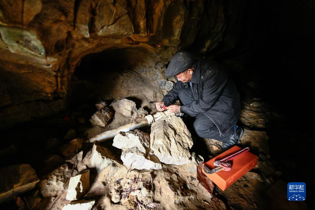 管水員陳光明在貴定縣盤(pán)江鎮馬場(chǎng)河村的溶洞水源點(diǎn)維修水管(3月23日攝)。