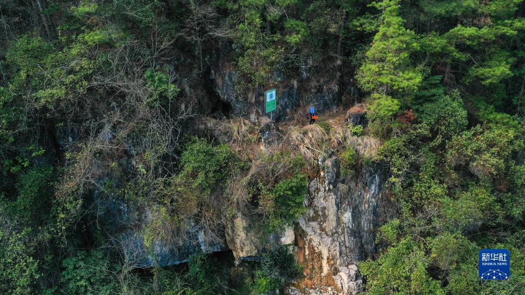 在貴定縣盤(pán)江鎮馬場(chǎng)河村,管水員陳光明在半山腰上的溶洞水源點(diǎn)附近巡護水管(3月23日攝,無(wú)人機照片)。