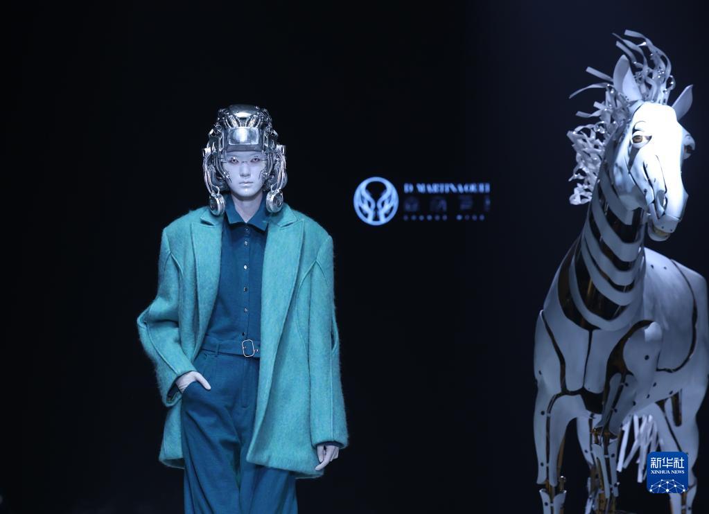 當日,主題為“視界·邊界”的時(shí)裝秀在北京舉行的中國國際時(shí)裝周2023秋冬系列上上演。設計師丁潔以婦好鸮尊為設計靈感,模特佩戴3D打印發(fā)飾,繞行秀場(chǎng)特別設置的“戰馬”,上演了一場(chǎng)歷史與未來(lái)“時(shí)空對話(huà)”的時(shí)裝秀。