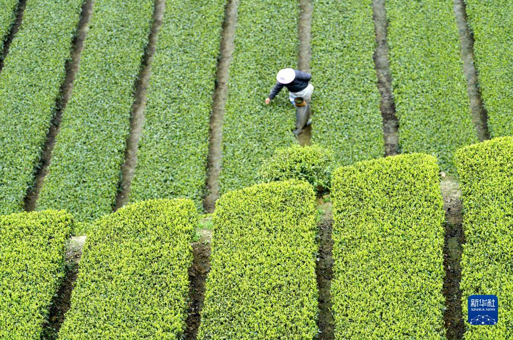3月27日,茶農在湖北省宣恩縣椒園鎮慶陽(yáng)壩村的茶園采茶。
