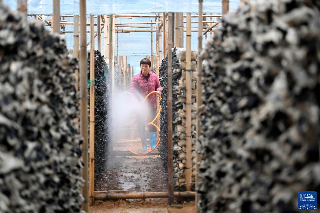 3月27日,在柳州市柳城縣社沖鄉柳州螺螄粉原材料基地里,農民在木耳基地大棚里澆水。