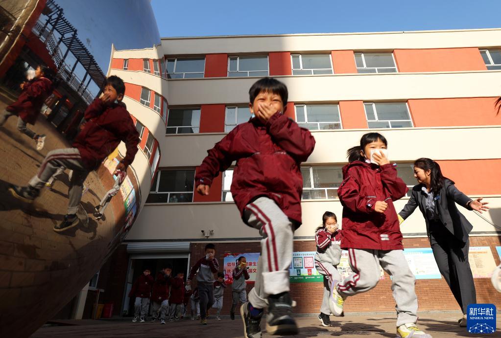 3月27日,河北省石家莊市沿西街小學(xué)學(xué)生在老師指揮下進(jìn)行應急避險逃生演練。