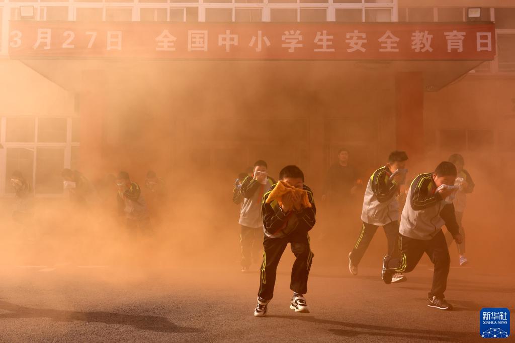 3月27日,在山東省棗莊市江山實(shí)驗學(xué)校,學(xué)生進(jìn)行消防應急逃生演練。