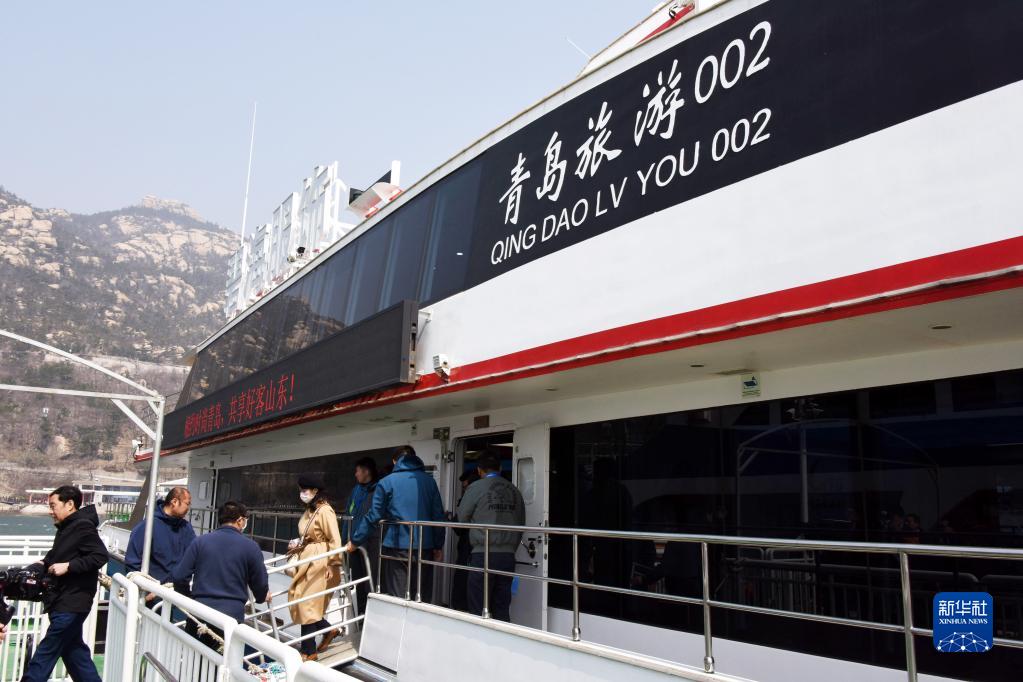 3月27日,在青島嶗山太清游船碼頭,游客下船準備游覽嶗山。