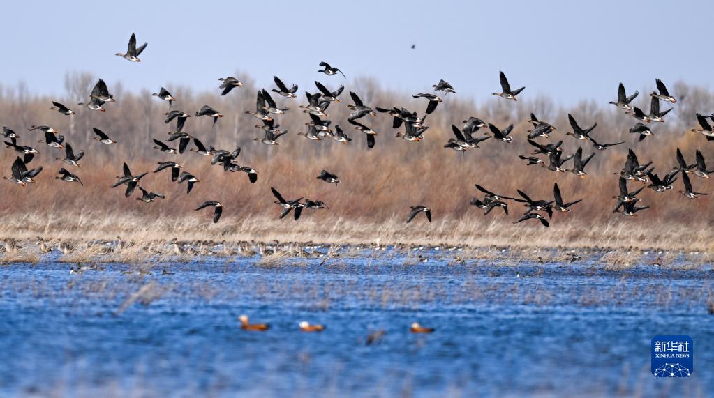 3月27日,成群的鴻雁在孟家段國家濕地公園飛翔。