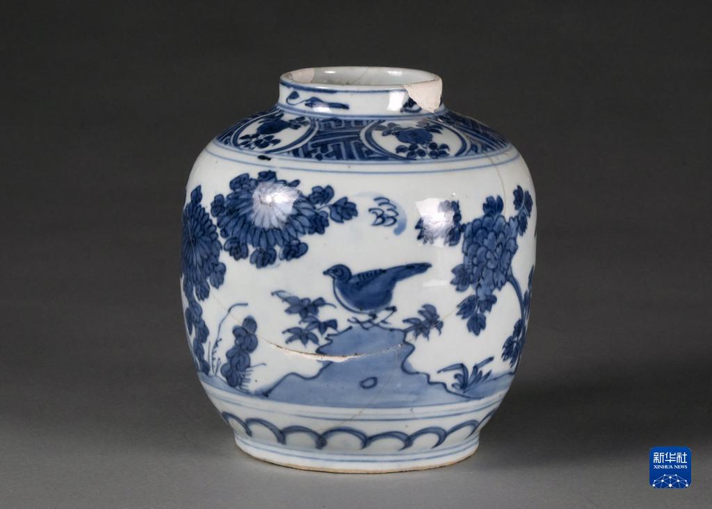 河南開(kāi)封州橋及附近汴河遺址出土的明晚期景德鎮窯青花花卉紋罐(資料照片)。