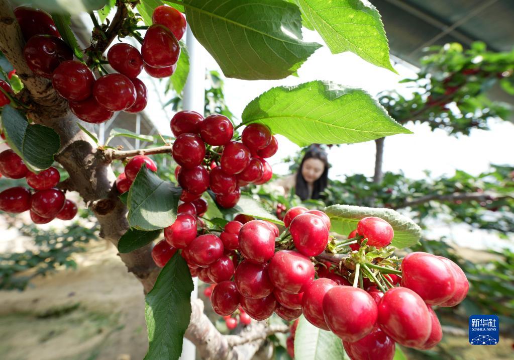 3月28日,游客在秦皇島市海港區海陽(yáng)鎮常香苑家庭農場(chǎng)的大棚內采摘櫻桃。