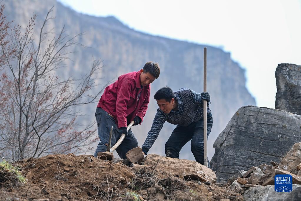 村民牛何松(右)和牛麗朋在位于山西省壺關(guān)縣大峽谷鎮青龍峽村的太行山上采石(3月23日攝)。新華社記者 楊晨光 攝