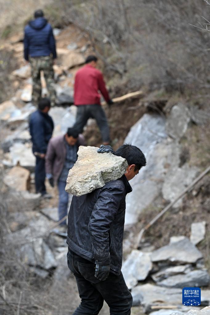 在山西省壺關(guān)縣大峽谷鎮青龍峽村,牛何松(前)在搬運石頭(3月23日攝)。新華社記者 詹彥 攝