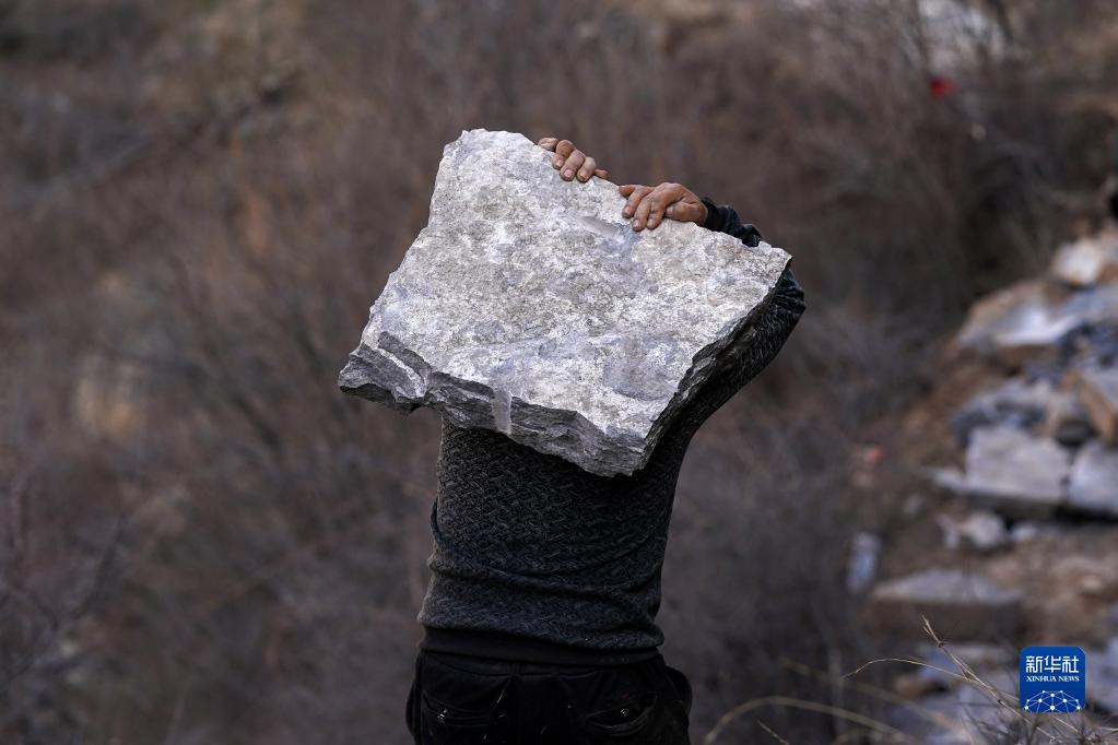 山西省壺關(guān)縣大峽谷鎮青龍峽村村民牛永剛在搬運石頭(3月7日攝)。新華社記者 詹彥 攝