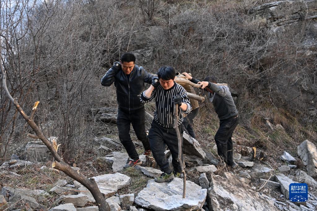 在位于山西省壺關(guān)縣大峽谷鎮青龍峽村的太行山上,村民挑著(zhù)石塊運往修路現場(chǎng)(3月7日攝)。新華社記者 楊晨光 攝