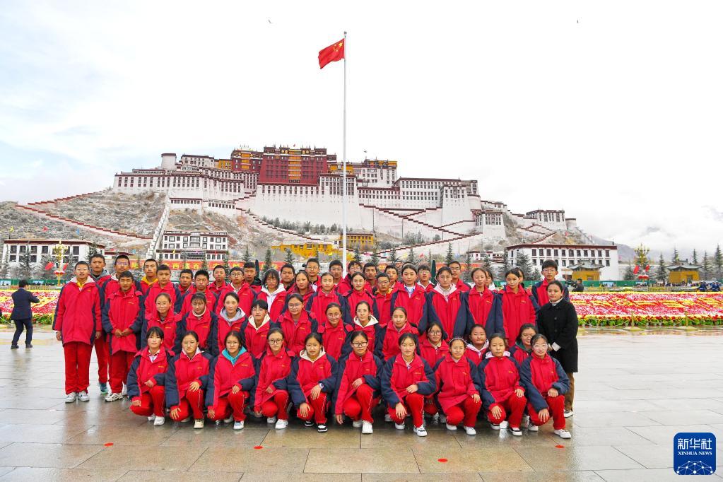 3月28日,在拉薩布達拉宮,參加升旗儀式的師生在廣場(chǎng)合影留念。