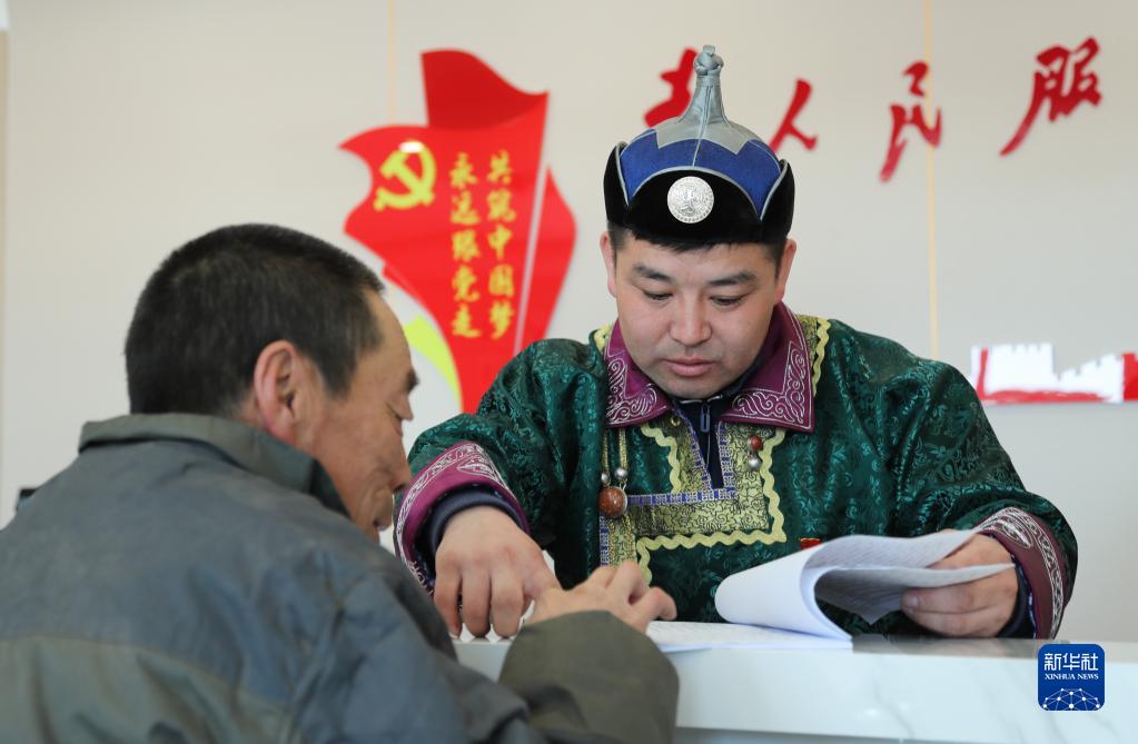 3月28日,在巴彥額日和圖嘎查黨群服務(wù)中心,一名黨員向牧民介紹相關(guān)政策。