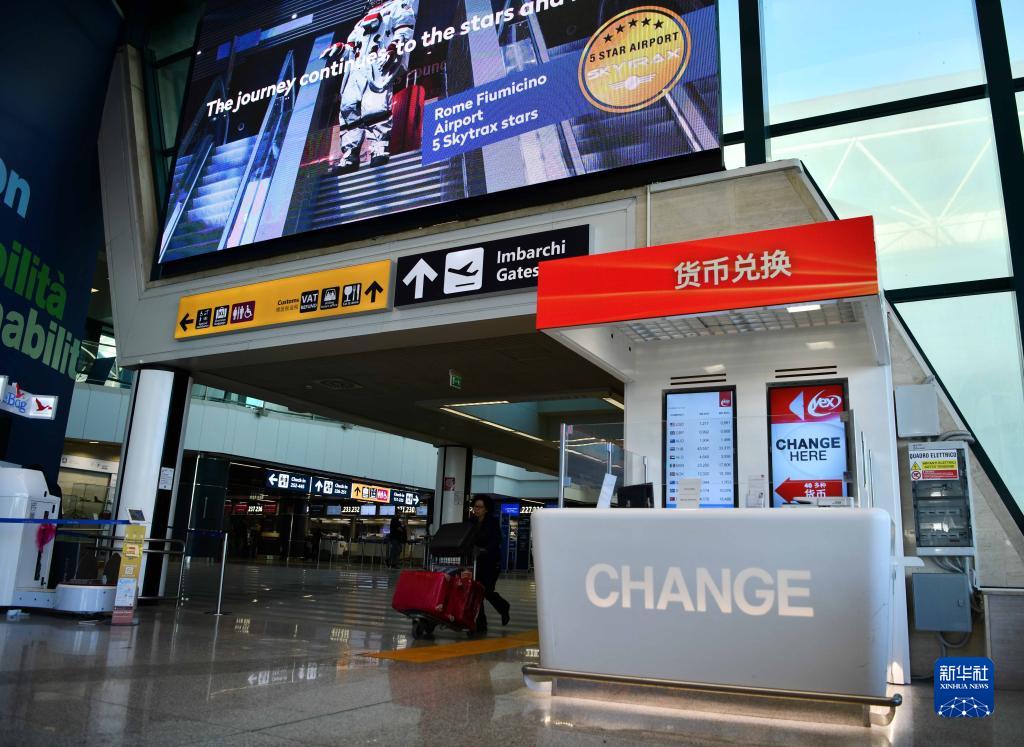 這是3月27日在意大利羅馬菲烏米奇諾機場(chǎng)拍攝的中文指示牌。