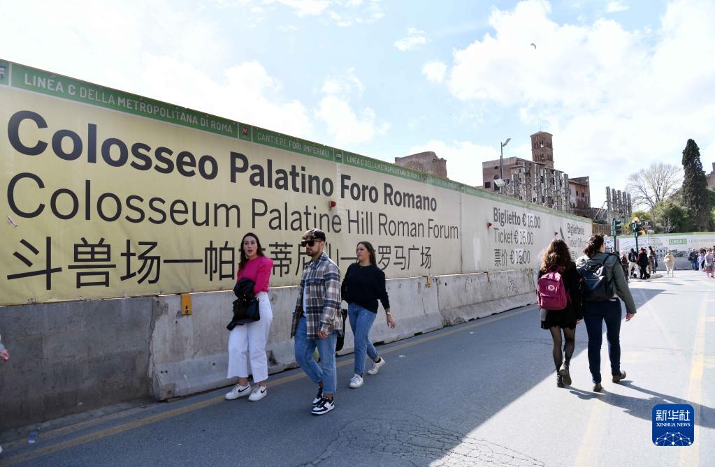 3月26日,游客走過(guò)意大利羅馬斗獸場(chǎng)的中文指示牌。