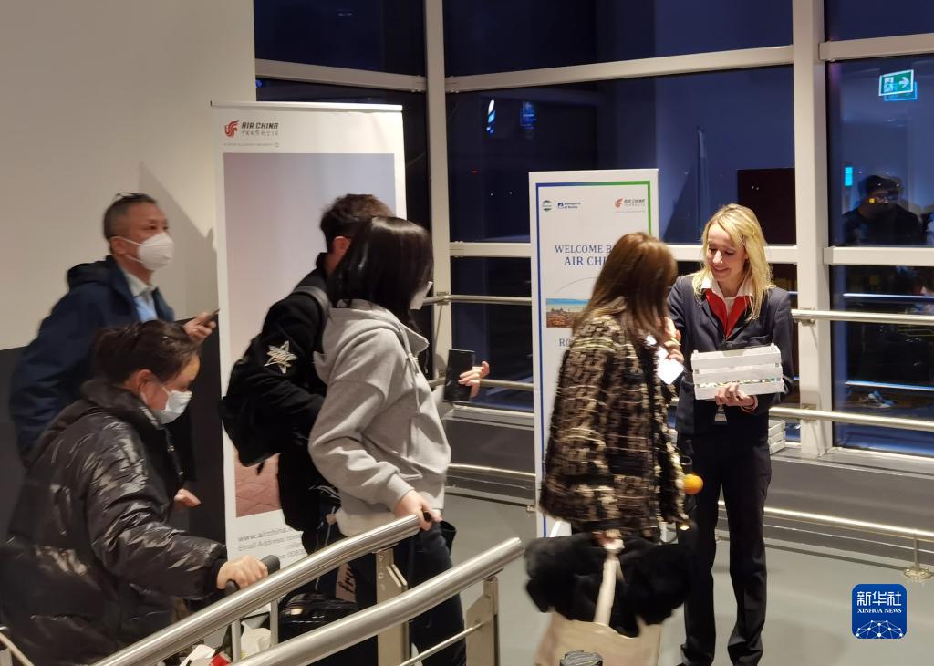 3月27日,工作人員向抵達意大利羅馬菲烏米奇諾機場(chǎng)的中國旅客贈送禮物。