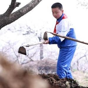 3月28日,內丘縣大都城小學(xué)學(xué)生在梨園鋤草。
