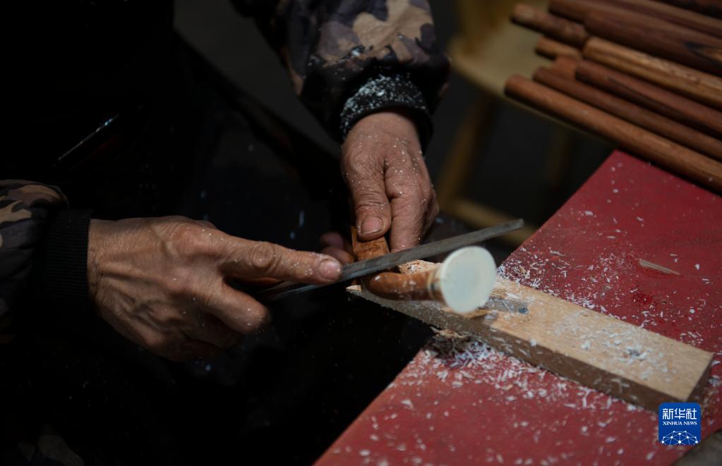 3月28日,在江蘇無(wú)錫梅村街道二胡產(chǎn)業(yè)園,工人在制作琴桿。