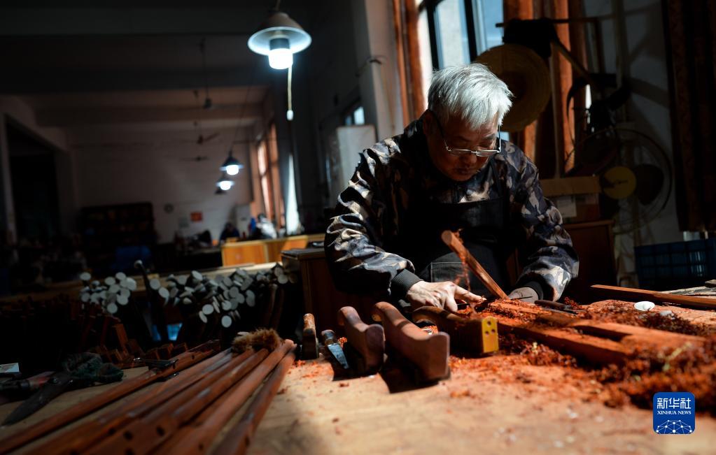3月28日,在江蘇無(wú)錫梅村街道二胡產(chǎn)業(yè)園,工人在制作琴桿。