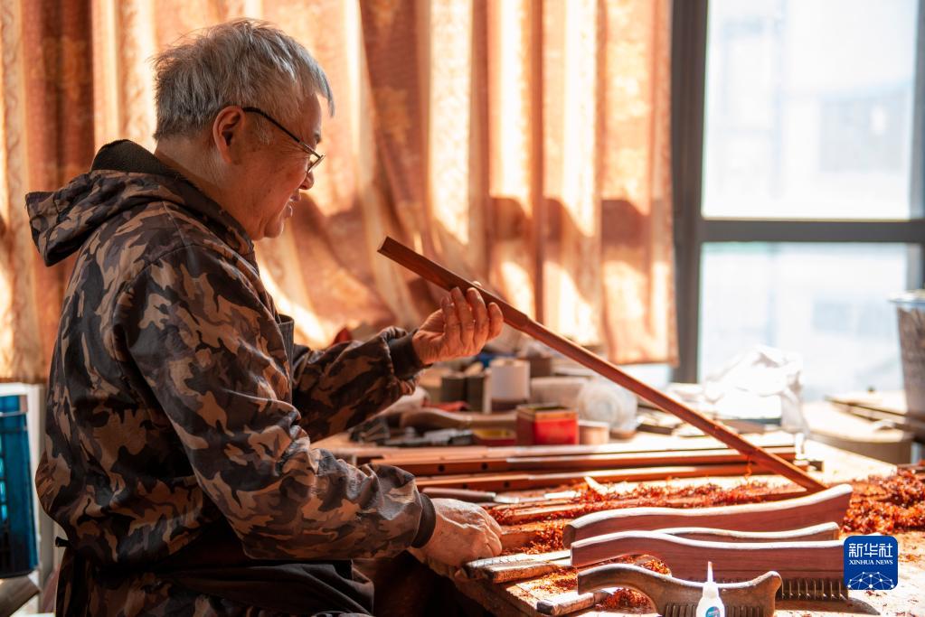 3月28日,在江蘇無(wú)錫梅村街道二胡產(chǎn)業(yè)園,工人在制作琴桿。