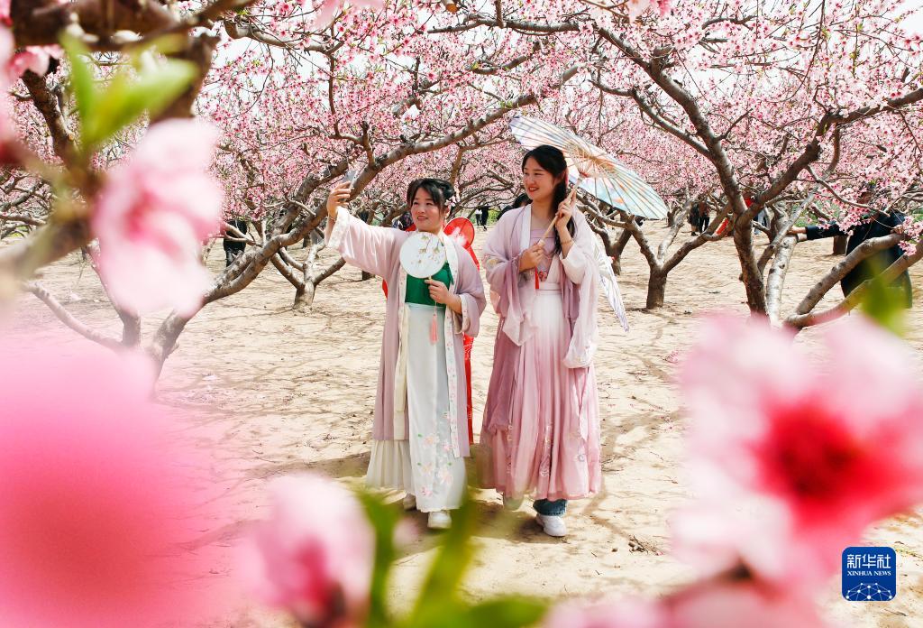 3月28日,在河南省開(kāi)封市尉氏縣張市鎮萬(wàn)畝桃園,游人在盛開(kāi)的桃花林中賞花拍照。