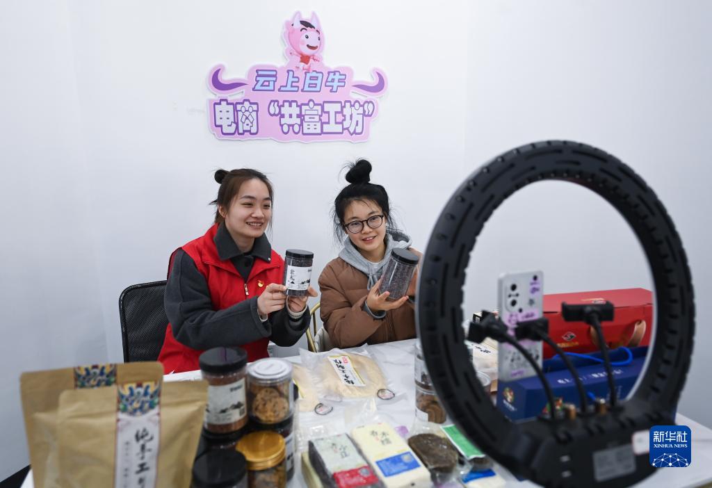 3月28日,在杭州市臨安區昌化鎮白牛村的云上白?!る娚獭肮哺还し弧敝辈ラg,網(wǎng)格黨員(左)與電商主播一起推介特色農產(chǎn)品。