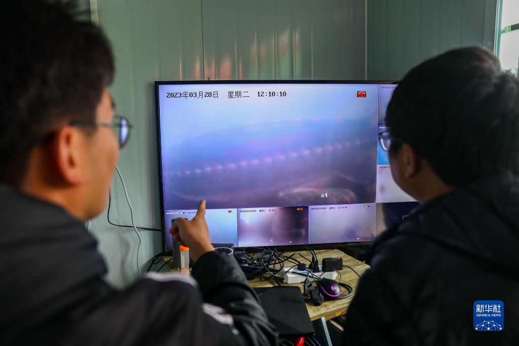 3月28日,在四川省宜賓市江安縣長(cháng)江鱘野化繁殖試驗駐地,研究人員通過(guò)水下攝影機觀(guān)察長(cháng)江鱘親魚(yú)的活動(dòng)情況并進(jìn)行記錄。