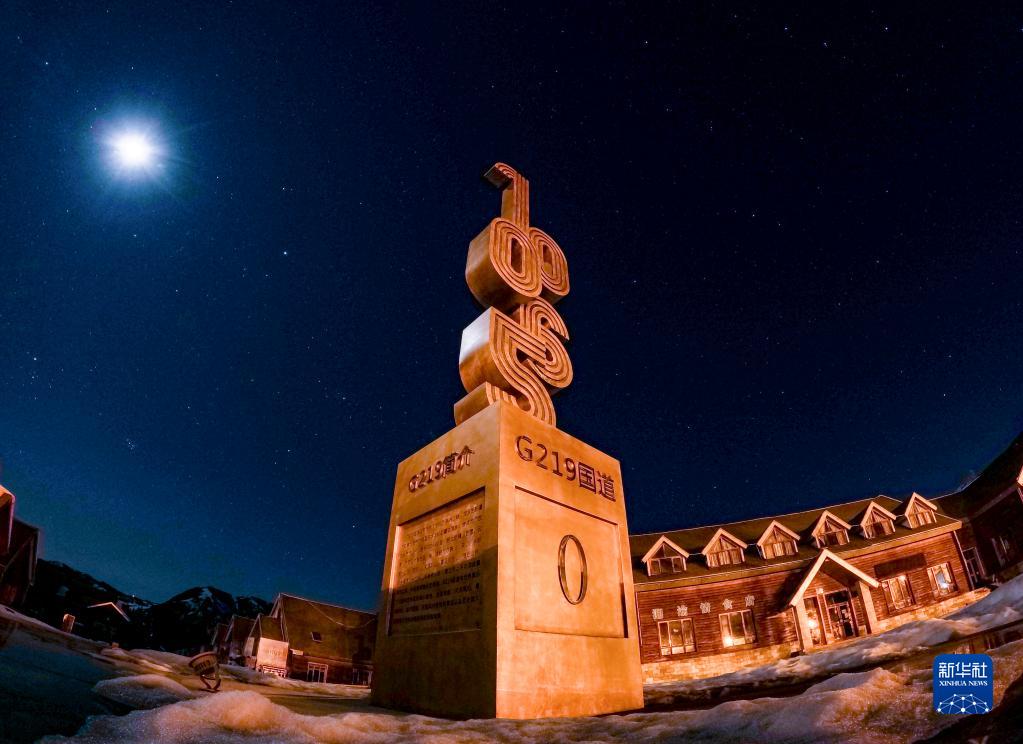 3月28日夜晚拍攝的G219國道0公里紀念碑。